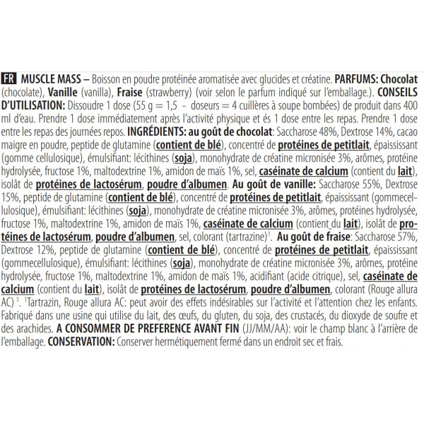 Die verschiedenen enthaltenen Proteine (9,4 g) sind: Molkekonzentrat, hydrolysiertes Protein, Kasein, Molkeisolat und Eiweiß. Sie unterscheiden sich durch eine unterschiedliche Absorptionsdauer. Muscle Mass wird idealerweise nach dem Training in der Phase des Masseaufbaus verzehrt. Wenn du Schwierigkeiten hast, Gewicht zuzulegen, solltest du deinen Proteinbedarf nicht aus einer einzigen Quelle decken, sondern komplexe Formeln bevorzugen, die aus Proteinen mit unterschiedlicher Absorptionsdauer bestehen.
