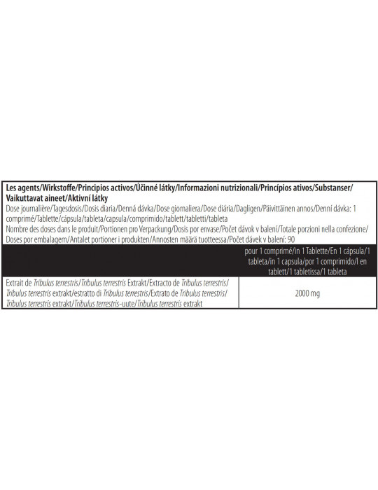 Zutaten: Fruchtextrakt aus Tribulus terrestris 95,2 %, Füllstoffe (mikrokristalline Zellulose, Calciumphosphate), Trennmittel (Siliciumdioxid, Magnesiumsalze von Speisefettsäuren), Überzugsmittel [agents d’enrobage (hydroxypropylméthylcellulose, hydroxypropylcellulose), amidon modifié, chaîne moyenne de triglycérides, anti-agglomérant (talc), stabilisant (polyéthylène glycol)].