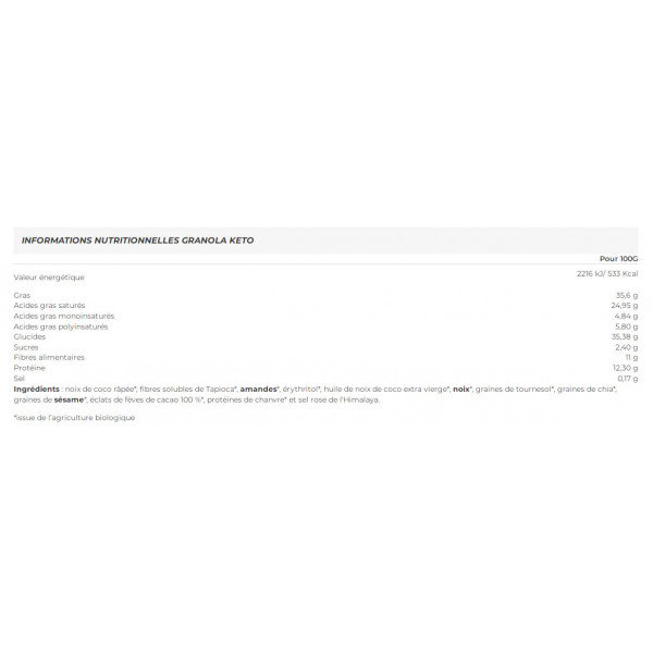 Zutaten: Kokosraspeln*, lösliche Tapiokafasern*, Mandeln*, Erythrit*, natives Kokosnussöl extra*, Walnüsse*, Sonnenblumenkerne*, Chiasamen*, Sesamsamen*, Kakaobohnensplitter 100 %*, Hanfprotein* und rosa Salz vonHimalaya.