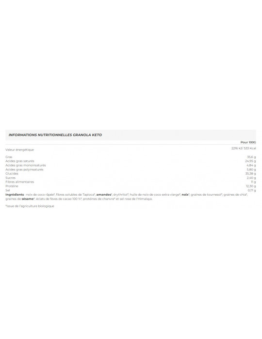 Da dieses Granola aus natürlichen und pflanzlichen Zutaten besteht, ist es auch für Veganer geeignet. Es ist glutenfrei, biologisch und vegan . Auf der Basis von Kokosraspeln enthält es auch Superfoods, Samen, hochwertige Nüsse und pflanzliche Proteine. Dieses Keto-Granola enthält 12,3 g Protein pro 100 g. Es ist der ideale zuckerarme Snack!