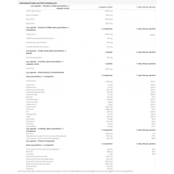 Net weight : 310 gEin Beutel enthält: 1 Tablette Multivitamin & Multimineral, 1 Tablette CaZnMg, 1 Omega-3-Weichkapsel, 1 Lecithin-Weichkapsel, 1 Tablette Pflanzen & Enzyme, 1 Kapsel Grape Seed, 1 Tablette Vitamin C1000.