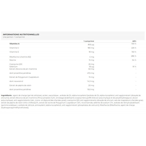 Zutaten: füllstoff (Cellulosegel), L-Ascorbinsäure , DL-alpha-Tocopherol-Acetat [acétate de DL-alpha-tocophérol, anti-agglomérant (dioxyde de silicium)], Seekieferrindenextrakt (Pinus pinaster) 5,2%, Überzugsmittel [stabilisants (copolymère greffé d’alcool polyvinylique et de polyéthylèneglycol, alcool polyvinylique), anti-agglomérants (talc, mono- et diglycérides d’acides gras)], Coenzym Q10, Trennmittel (Siliciumdioxid, magnesiumsalze von Speisefettsäuren), Traubenkernextrakt (Vitis vinifera)2,1%, Polygonum cuspidatum-Wurzelextrakt 1,6%, Nicotinamid, Natriumselenit 1,1%, Retinylacetat [stabilisant (gomme arabique ), acétate de rétinyle, antioxydant (alpha-tocophérol), anti-agglomérant (phosphates de calcium)], Riboflavin [Riboflavine, agent de charge (hydroxypropylméthylcellulose)].