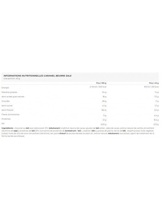 Zutaten: milchschokolade mit Süßungsmittel 31%[Süßungsmittel (Maltitol), Kakaobutter, Vollmilchpulver, Kakaomasse, natürliches Vanillearoma, Emulgator ( Sojalecithin)], Milcheiweiß 20% ( Molkenproteinkonzentrat ( Milch ), Kasein ( Milch )), palmfett, Weizenmehl, Oligofruktose, Pflanzenöl (Raps), Kokosnussöl, Emulgator (Lecithin), Salz, Eigelb von Freilandhühnern, natürliches Aroma, Süßungsmittel (Sucralose), Mehlbehandlungsmittel (Ascorbinsäure)