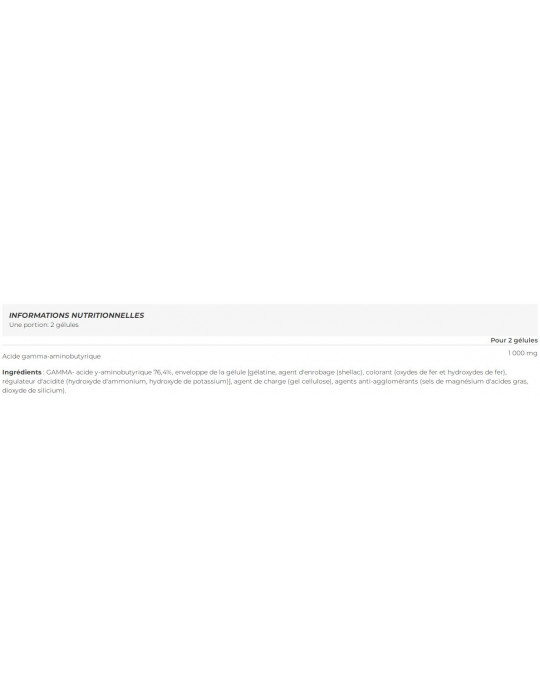 Zutaten: GAMMA- y-Aminobuttersäure 76,4%, Kapselhülle [gélatine, agent d'enrobage (shellac), colorant (oxydes de fer et hydroxydes de fer), régulateur d'acidité (hydroxyde d'ammonium, hydroxyde de potassium)], Füllstoff (Cellulosegel), Trennmittel (Magnesiumsalze von Speisefettsäuren, Siliciumdioxid).