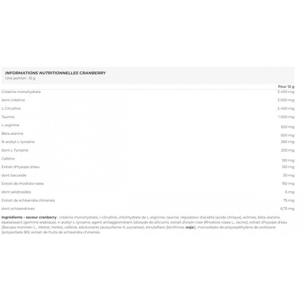 Zutaten - Cranberry-Geschmack: Kreatinmonohydrat, L-Citrullin, L-Argininhydrochlorid, Taurin, Säureregulator (Zitronensäure), Aromastoffe, Beta-Alanin, Verdickungsmittel (Gummi arabicum), N-Acetyl-L-Tyrosin, Trennmittel (Siliciumdioxid), Extrakt aus rosa Knabenkraut (Rhodiola rosea L., wurzel), Extrakt aus Wasser-Ysop (Bacopa monnieri L., Wettst, Kraut), Koffein, Süßstoffe (Acesulfam-K, Sucralose), Emulgator [Lecithine (Soja)], Polyoxyethylensorbitanmonooleat (Polysorbat 80), Fruchtextrakt aus Schisandra chinensis.