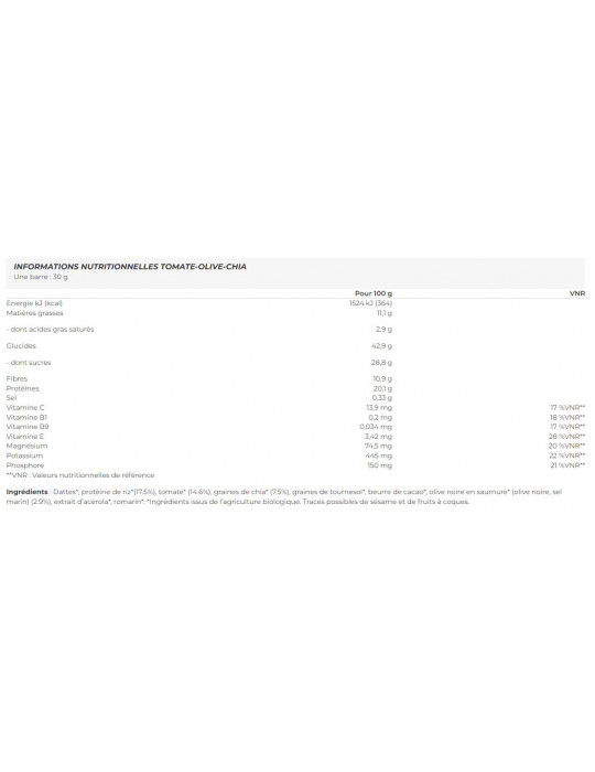 Zutaten: Datteln*, Reisprotein*(17.5%), Tomate* (14.6%), Chiasamen* (7.5%), Sonnenblumenkerne*, Kakaobutter*, schwarze Oliven in Salzlake* (schwarze Oliven, Meersalz) (2.9%), Acerolaextrakt*, Rosmarin*. *Zutaten aus biologischem Anbau. Spuren von Sesam und Schalenfrüchten möglich.