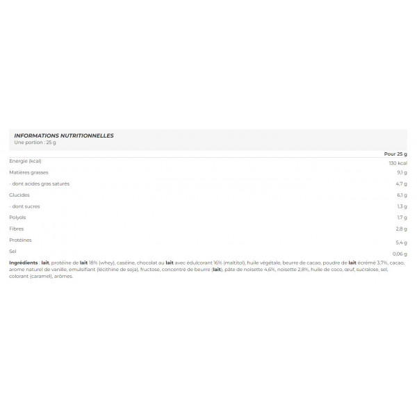 Zutaten: Milch, Milchprotein 18% (Whey), Kasein, Milchschokolade mit Süßungsmittel 16% (Maltit), pflanzliches Öl, Kakaobutter, Magermilchpulver 3,7%, Kakao, natürliches Vanillearoma, Emulgator (Sojalecithin), Fructose, Butterkonzentrat (Milch), Haselnusspaste 4,6%, Haselnuss 2,8%, Kokosöl, Ei, Sucralose, Salz, Farbstoff (Karamell), Aromen.