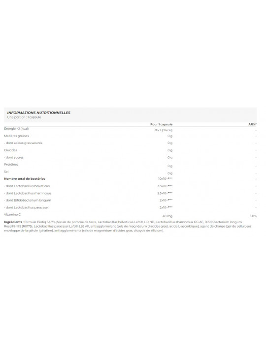 Zutaten: Biotiq-Formel 54,7% [fécule de pomme de terre, Lactobacillus helveticus Lafti® L10 ND, Lactobacillus rhamnosus GG AF, Bifidobacterium longum Rosell®-175 (R0175), Lactobacillus paracasei Lafti® L26 AF, antiagglomérant (sels de magnésium d'acides gras), acide L-ascorbique], Füllstoff (Cellulosegel), Kapselhülle (Gelatine), Trennmittel (Magnesiumsalze von Speisefettsäuren, Siliciumdioxid).