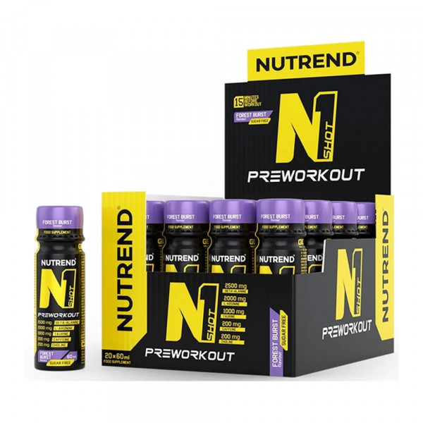 Packung N1 Shot (20x60ml) der Marke Nutrend, sind trinkfertige Shots, die du einige Minuten vor dem Training verwenden kannst.