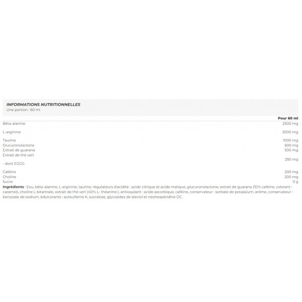 Zutaten: Wasser, Beta-Alanin, L-Arginin, Taurin, Säureregulatoren: Zitronensäure und Apfelsäure, Glucuronolacton, Guaranaextrakt (10 % Koffein, Farbstoff: Karamell), Cholin L-Bitartrat, Grünteeextrakt (40 % L-Theanin ), Antioxidationsmittel: ascorbinsäure, Koffein, Konservierungsmittel: Kaliumsorbat, Aroma, Konservierungsmittel: Natriumbenzoat, Süßstoffe: Acesulfam K, Sucralose, Steviolglykoside und Neohesperidin DC.