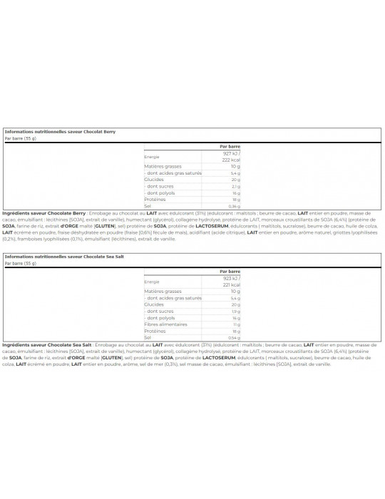Zutaten Geschmacksrichtung Chocolate Berry: Süßstoffhaltiger Schokoladenüberzug aus MILCH (31%) (Süßstoff: Maltitole; Kakaobutter, Vollmilchpulver, Kakaomasse, Emulgator : lecithinen [SOJA], Vanilleextrakt), Feuchthaltemittel (Glycerin), hydrolysiertes Kollagen, MILCHprotein, knusprige SOJA-Stücke (6,4%) ( SOJA-Protein, Reismehl, Extrakt aus gemälzter Gerste[GLUTEN], Salz) SOJA-Protein, LACTOSERUM-Protein, Süßungsmittel ( Maltitole, Sucralose), kakaobutter, Rapsöl, Magermilchpulver, Erdbeerpulver (Erdbeere [0,6%] Maisstärke), Säuerungsmittel (Zitronensäure), Vollmilchpulver, natürliches Aroma, gefriergetrocknete Sauerkirschen (0,2%), gefriergetrocknete Himbeeren (0,1%), Emulgator (Lecithine), Vanilleextrakt.