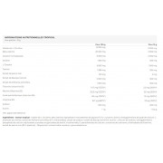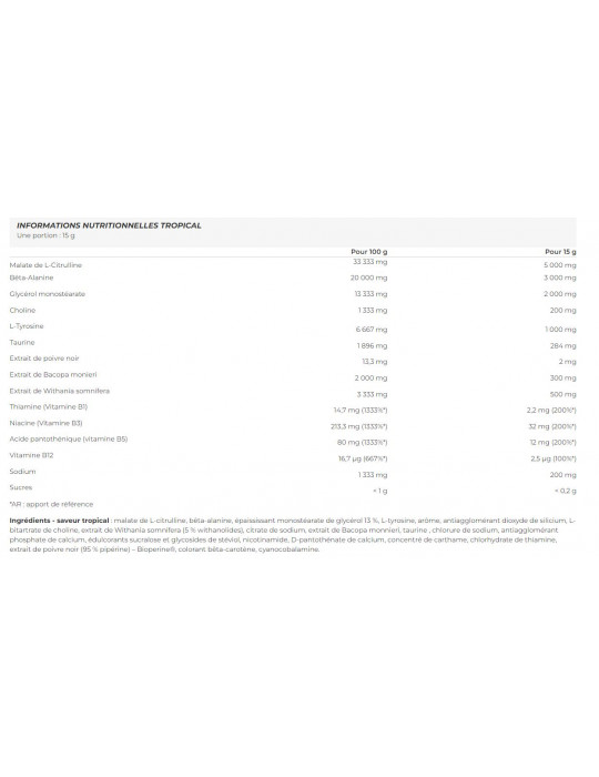 Zutaten - tropischer Geschmack: l-Citrullinmalat, Beta-Alanin, Verdickungsmittel Glycerinmonostearat 13 %, L-Tyrosin, Aroma, Trennmittel Siliciumdioxid, Cholin-L-Bitartrat, Extrakt aus Withania somnifera (5 % Withanolide), Natriumcitrat, Extrakt aus Bacopa monnieri, Taurin , Natriumchlorid, trennmittel Calciumphosphat, Süßstoffe Sucralose und Steviolglykoside, Nicotinamid, Calcium-D-Pantothenat, Distelkonzentrat, Thiaminhydrochlorid, Extrakt aus schwarzem Pfeffer (95 % Piperin) - Bioperine®, Farbstoff Beta-Carotin, Cyanocobalamin.