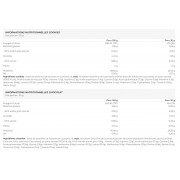 Cookie-Zutaten : Molkeproteinisolat (enthält Soja), Emulgator (Sonnenblumenlecithin), Aromen (Keks), Süßungsmittel (Sucralose), Enzym Laktase 10000 ALU/g. Aminosäureprofil pro 100g : Alanin (4,7g), Arginin (2,1g), Asparaginsäure (11,4g), Cystin (2,6g), Glutaminsäure (17,5g), Glycin (1,8g), Histidin (1,7g), Isoleucin (6,8g), Leucin (10,7g), Lysin (10,4g), Methionin (2,3g), Phenylalanin (3,0g), Prolin (5,9g), Serin (4,4g), Threonin (7,0g), Tryptophan (2,1g), Tyrosin (3,0g), Valin (5,4g).