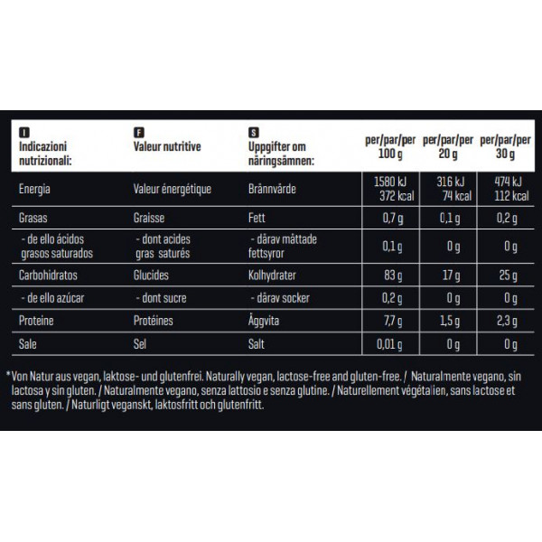 Du kannst diesen Snack mit frischen Früchten, Nüssen, einem Whey-Protein oder einigen Geschmackstropfen (Flav drops 50ml) kombinieren, alle Kombinationen sind möglich! Du hast die Wahl, die Konsistenz deines Snacks anzupassen, ob du ihn lieber cremig oder dickflüssig magst. Dieser Reispudding ist mit 17 g Kohlenhydraten pro 20g-Portion reich an Kohlenhydraten , was dir vor oder nach deinem Training eine konsequente Quelle liefert.