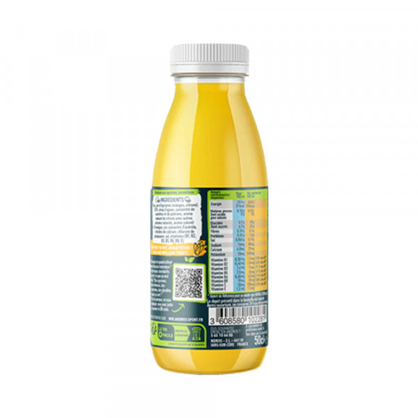 Zutaten - Zitrusgeschmack: Wasser, Zitrussaft (Orangen, Zitronen) 33%, Agavensirup, Karotten- und Kürbiskonzentrat, natürliches Zitronenaroma mit anderen natürlichen Aromen, natürliches Orangenaroma, Acerola-Saftkonzentrat, Calciumcitrate, Kaliumchlorid, Salz, Vitamine (B1, B2, B3, B5, B6, B8, E).