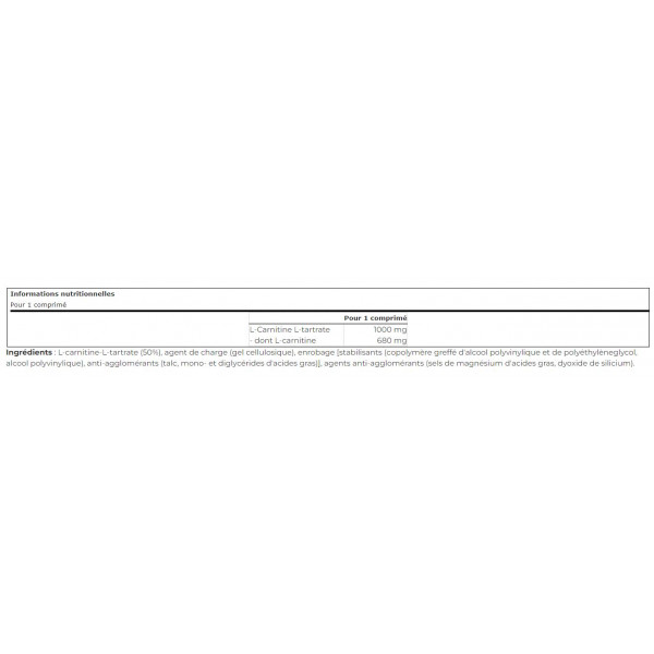Zutaten: L-Carnitin-L-Tartrat (50%), Füllstoff (Zellulosegel), Überzugsmittel [stabilisants (copolymère greffé d'alcool polyvinylique et de polyéthylèneglycol, alcool polyvinylique), anti-agglomérants (talc, mono- et diglycérides d'acides gras)], Trennmittel (Magnesiumsalze von Speisefettsäuren, Siliciumdioxid).