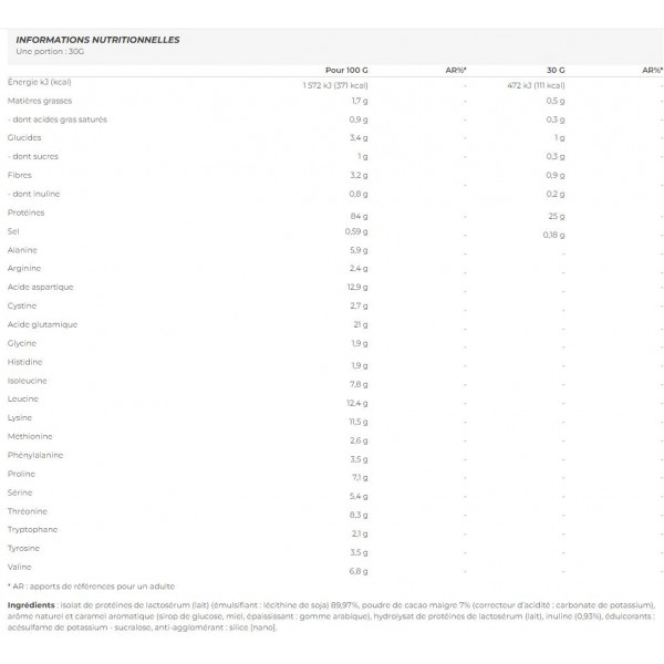 Zutaten: Molkenproteinisolat (Milch) (Emulgator: Sojalecithin) 89,97%, mageres Kakaopulver 7% (Säureregulator: Kaliumcarbonat), natürliches Aroma und aromatisches Karamell (Glukosesirup, Honig, Verdickungsmittel: gummi arabicum), Molkenproteinhydrolysat (Milch), Inulin (0,93%), Süßungsmittel: Acesulfam-Kalium - Sucralose, Antiklumpmittel: Siliciumdioxid [nano].