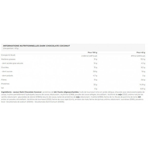 Zutaten - GeschmackDark Chocolate Coconut: Proteine aus milch, , fructo-oligosaccharide, sonnenblumenöl, reich an Ölsäure, Schokolade mit Süßungsmitteln [Kakaomasse, teilweise hydrolysiertes Inulin, Kakaobutter, Süßungsmittel: Erythrit (E968), fettarmes Kakaopulver, Emulgator: Lecithin (E968), Kakaobutter, Kakaopulver (E968), Kakaopulver, Emulgator: Lecithin (E968) soja (E322), natürliches Vanillearoma, Süßungsmittel: Steviolglykoside (E960)], Kakaobutter, Eiweißisolat von soja, süßungsmittel: Maltitol (E965), Reismehl, Kartoffelstärke, milch vollkornpulver, Emulgator: Sonnenblumenlecithin (E322), Kokosmehl rapè (0,4%), Maisstärke, Quinoamehl, Aroma, Süßstoff: Sucralose (E955), Backtriebmittel: Natriumbicarbonat (E500ii) - Ammoniumbicarbonat (E503ii).