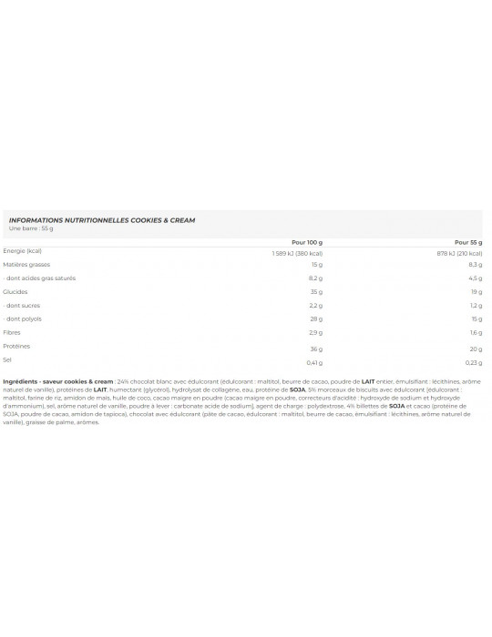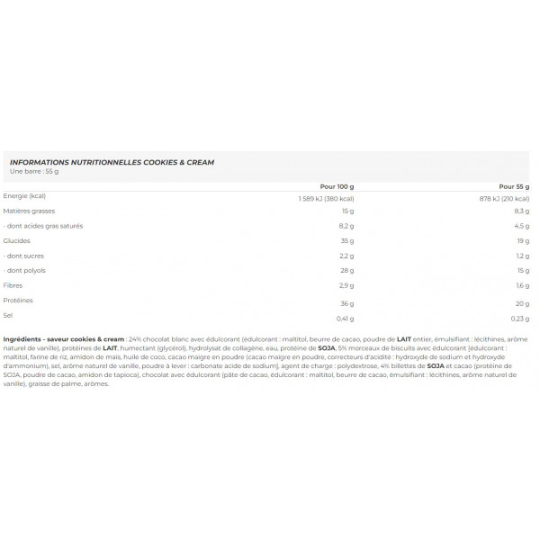 Zutaten - Geschmacksrichtung Cookies & Cream 24% weiße Schokolade mit Süßstoff (Süßstoff: Maltitol, Kakaobutter, Kakaopulver, Kakaopulver, Kakaopulver, Kakaopulver, Kakaopulver) MILCH vollkorn, Emulgator: Lecithine, natürliches Vanillearoma), Protein aus MILCH, feuchthaltemittel (Glycerin), Kollagen-Hydrolysat, Wasser, Kollagenprotein, Wasser, Protein SOJA, 5% Keksteile mit Süßstoff [édulcorant : maltitol, farine de riz, amidon de maïs, huile de coco, cacao maigre en poudre (cacao maigre en poudre, correcteurs d'acidité : hydroxyde de sodium et hydroxyde d'ammonium), sel, arôme naturel de vanille, poudre à lever : carbonate acide de sodium], füllstoff: Polydextrose, 4% Knüppel aus SOJA und Kakao (SOJA-Protein, Kakaopulver, Tapiokastärke), Schokolade mit Süßungsmittel (Kakaomasse, Süßungsmittel: Maltitol, Kakaobutter, Emulgator: Lecithine, natürliches Vanillearoma), Palmfett, Aromen.