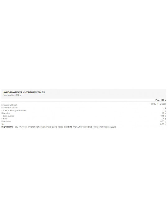 Zutaten: Wasser (95,45 %), Amorphophallus Konjac (3,5 %),Haferfasern (0,3 %), Sojabohnenfasern (0,6 %), Stabilisator (E526).