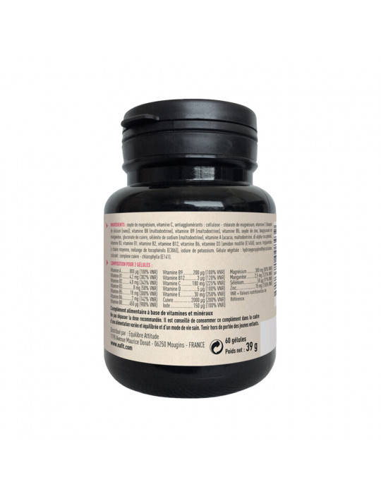 Zutaten: Magnesiumoxid, Vitamin C, Antiklumpmittel : cellulose - Magnesiumstearat, Vitamin E, Vitamin B8 (Maltodextrin), Vitamin B9 (Maltodextrin), Vitamin B5, Zinkoxid, Manganbisglycinat, Kupfergluconat, Natriumselenit (Maltodextrin), Vitamin A (Akazie, Maltodextrin, dl-alpha-Tocopherol), Vitamin B3, Vitamin B1, Vitamin B2, Vitamin B12, Vitamin B6, Vitamin D (modifizierte Stärke (E1450), Saccharose, Gummi arabicum (E414), raffiniertes Sonnenblumenöl, dl-alpha-Tocopherol (E307)), Kaliumiodid. Pflanzliche Gelatine: Hydroxypropylmethylcellulose, Farbstoff: Kupfer-Chlorophyll-Komplex (E141).