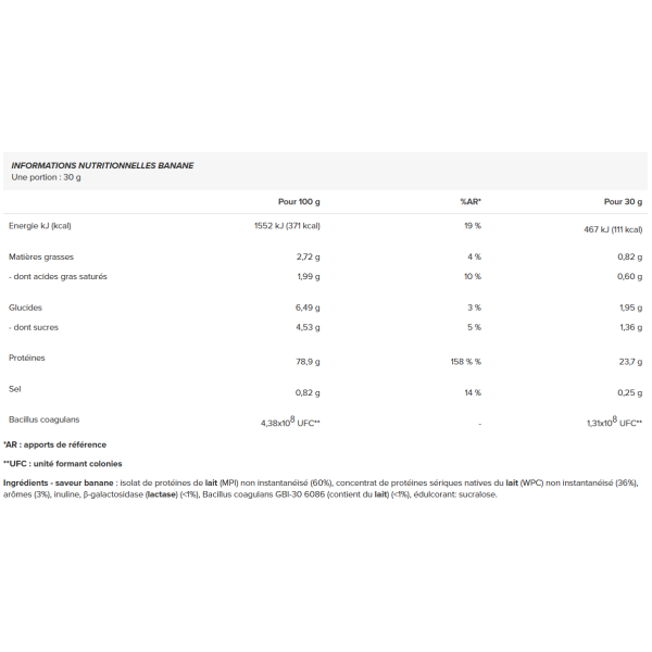 Zutaten - Bananengeschmack: Nicht instantisiertes Milchproteinisolat (MPI) (60%), nicht instantisiertes Konzentrat aus nativem Milchserumprotein (WPC) (36%), Aromastoffe (3%), Inulin, β-Galactosidase(Laktase) (<1%), Bacillus coagulans GBI-30 6086 (enthält Milch) (<1%), Süßungsmittel: Sucralose.