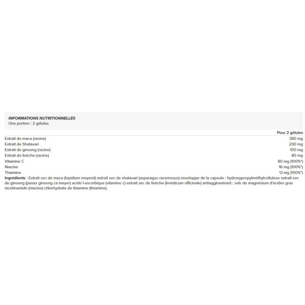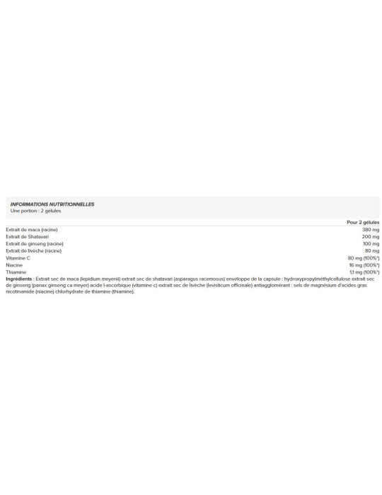 Zutaten: Maca-Trockenextrakt (lepidium meyenii) Shatavari-Trockenextrakt (asparagus racemosus) Kapselhülle: Hydroxypropylmethylcellulose Ginseng-Trockenextrakt (panax ginseng ca meyer) l-Ascorbinsäure (Vitamin c) Liebstöckel-Trockenextrakt (levisticum officinale) Trennmittel: Magnesiumsalze von Speisefettsäuren Nicotinamid (Niacin) Thiamin-Hydrochlorid (Thiamin).