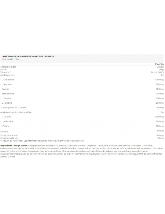 Zutaten Orange cooler : Aminosäuremischung (L-Glutamin, L-Leucin, Taurin, L-Arginin, L-Isoleucin, L-Valin, Beta-Alanin, L-Tyrosin, L-Histidin, L-Lysinhydrochlorid, Emulgator : sonnenblumenlecithin), Säuerungsmittel (Zitronensäure, Apfelsäure, L(+)-Weinsäure), Aroma, Farbstoffe (Beta-Carotin, Curcumin, Rübenrot), Inulin, Süßstoffe (Sucralose, Acesulfam-K), Verdickungsmittel (Natriumcarboxymethylcellulose, xanthangummi, Carrageenan), Trennmittel (Siliciumdioxid, Calciumsilikat), Grüntee-Extrakt (Camellia sinensis, Blatt), natürliches Koffein, L-Ascorbinsäure, Grünkaffee-Extrakt (Coffea arabica L. frucht).