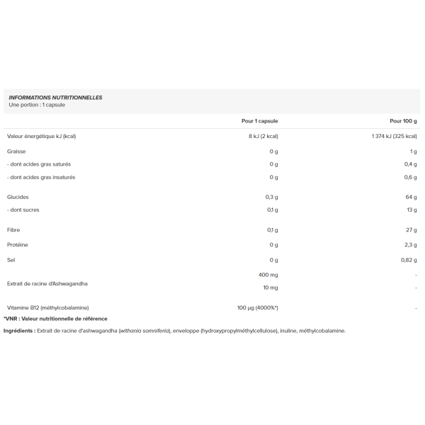 Zutaten: Extrakt aus Ashwagandha-Wurzel(Withania somniferia), Hülle (Hydroxypropylmethylcellulose), Inulin, Methylcobalamin.
