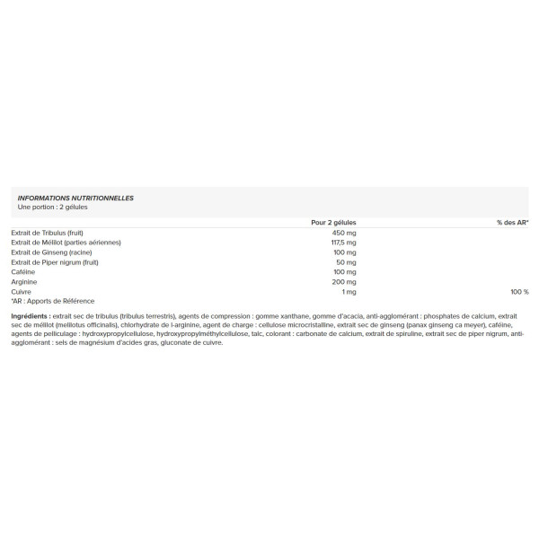 Zutaten: Tribulus-Trockenextrakt (Tribulus terrestris) Komprimierungsmittel: Xanthangummi, Akaziengummi Trennmittel: Calciumphosphate Trockenextrakt aus Steinklee (Melilotus officinalis) L-Arginin-Hydrochlorid Füllstoff: mikrokristalline Zellulose Trockenextrakt aus Ginseng (Panax ginseng ca meyer) Koffein Überzugsmittel: Hydroxypropylcellulose, Hydroxypropylmethylcellulose, Talkum, Farbstoff: Calciumcarbonat, Spirulinaextrakt Trockenextrakt aus Piper nigrum Trennmittel: Magnesiumsalze von Speisefettsäuren Kupfergluconat