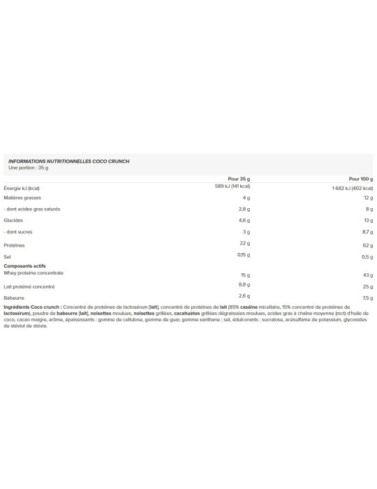 Zutaten Coco crunch: Molkenproteinkonzentrat[Milch], Milchproteinkonzentrat (85% mizellares Kasein, 15% Molkenproteinkonzentrat), Buttermilchpulver[Milch], gemahlene Haselnüsse, geröstete Haselnüsse, gemahlene, entfettete, geröstete Erdnüsse, mittelkettige Fettsäuren (mct) aus Kokosöl, magerer Kakao, Aroma, Verdickungsmittel: cellulosegummi, Guargummi, Xanthangummi; Salz, Süßungsmittel: Sucralose, Acesulfam-Kalium, Steviolglykoside aus Stevia.