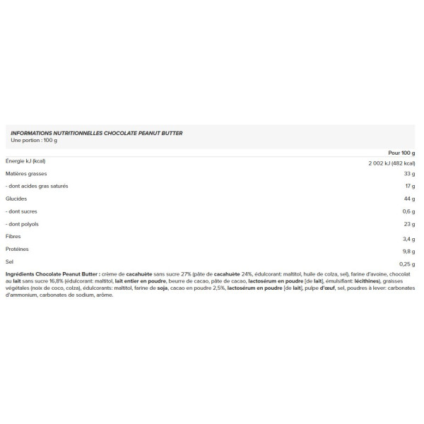 Zutaten Chocolate Peanut Butter: Erdnusscreme ohne Zucker 27% ( Erdnusspaste 24%, Süßungsmittel: Maltitol, Rapsöl, Salz), Hafermehl, Milchschokolade ohne Zucker 16,8% (Süßungsmittel: Maltitol, Vollmilchpulver, Kakaobutter, Kakaomasse, Molkenpulver [aus Milch], Emulgator: Lecithin), Haferflocken: lecithin), pflanzliche Fette (Kokosnuss, Raps), Süßungsmittel: Maltit, Sojamehl, Kakaopulver 2,5%, Molkenpulver [aus Milch], Eierpulpe, Salz, Backtriebmittel: Ammoniumcarbonate, Natriumcarbonate, Aroma.