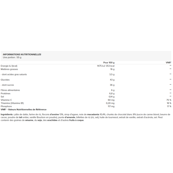 Zutaten: Dattelpaste, Reismehl, Haferflocken 13 %, Agavensirup, Macadamianüsse 10,4 %, weiße Schokoladenchunks 8 % (heller Rohrzucker, Kakaobutter, Vollmilchpulver, Bourbon-Vanillepulver), Mandelpüree, Reisknödel (Reis, Salz), Sonnenblumenöl, Vanilleextrakt, Acerolaextrakt, Salz. Kann Sesamsamen, Soja, Erdnüsse und andere Schalenfrüchte enthalten.