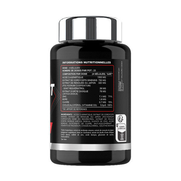 Zutaten: D-Asparaginsäure, Extrakt aus Cordyceps sinensis, Extrakt aus Japanischem Knöterich(Polygonum cuspidatum), dosiert mit Resveratrol, Extrakt aus Brennnesselblättern(Urtica dioica), Zinksulfat, Borsäure, Kupfergluconat, Antiklumpmittel (Magnesiumstearat), Cholecalciferol, Rindergelatine.