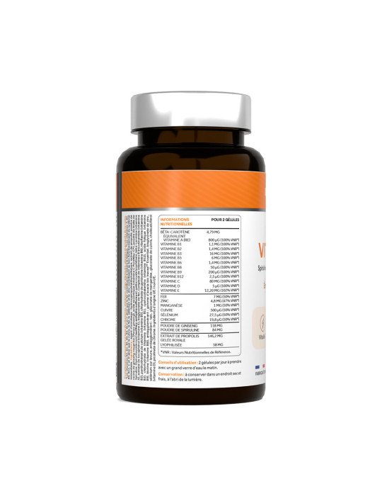 Zutaten: Überzugsmittel : hydroxypropylmethylcellulose, Propolisextrakt, Wurzelpulver aus rotem Bio-Ginseng(Panax ginseng), Ascorbinsäure (Vitamin C PureWay-C®), Spirulina-Thalluspulver(Spirulina platensis)(Sulfite-Schwefeldioxid), gefriergetrocknetes Gelée Royale, Beta-Carotin (Vitamin A), Tocopherolacetat (Vitamin E), eisenbisglycinat, Vitamin-B-Komplex (Nicotinamid (Vitamin B3), Calciumpantothenat (Vitamin B5), Pyridoxinhydrochlorid (Vitamin B6), Riboflavin (Vitamin B2), Thiaminhydrochlorid (Vitamin B1), Cyanocobalamin (Vitamin B12), Folsäure (Vitamin B9), Biotin (Vitamin B8)), Antiklumpmittel : inaveaTM Essential Bio-Akaziengummi, Zinkbisglycinat, Selen auf Hefe, Trennmittel: Talkum, Mangangluconat, Kupfergluconat, Cholecalciferol (Vitamin D), Chrompicolinat.
