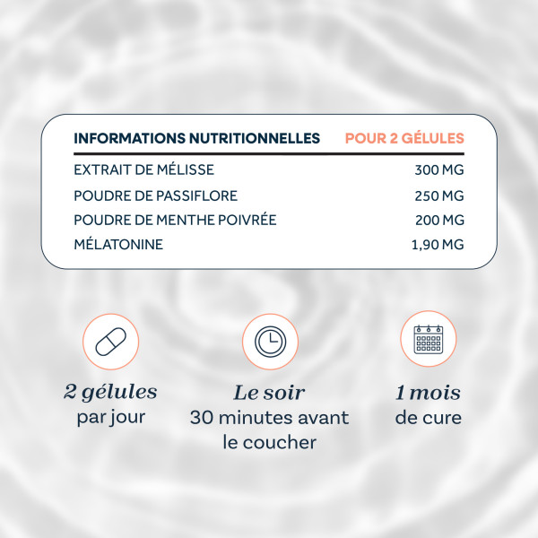 Zutaten: Trockenextrakt aus Melissenblättern(Melissa officinalis), Pulver aus den oberirdischen Teilen der Passionsblume(Passiflora incarnata), Pulver aus Pfefferminzblättern(Mentha piperita), Überzugsmittel: Hydroxypropylmethylcellulose, Pulver aus Bio-Apfelfasern.