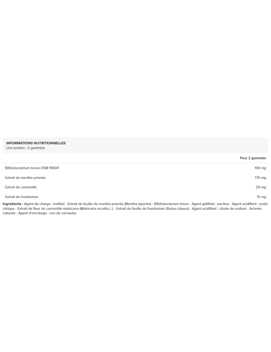 Zutaten: Füllstoff: Maltitol - Extrakt aus Pfefferminzblättern (Mentha piperita) - Bifidobacterium breve - Geliermittel: Pektin - Säuerungsmittel: Zitronensäure - Extrakt aus Kamillenblüten (Matricaria recutita L.) - Extrakt aus Himbeerblättern (Rubus idaeus) - Säuerungsmittel: Natriumcitrat - Natürliche Aromen - Überzugsmittel: Carnaubawachs.