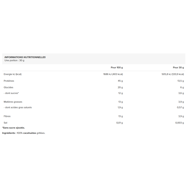 Jede Portion von 30 g liefert nur 120 kcal, mit 3,9 g Fett, von denen nur 0,57 g gesättigte Fettsäuren sind. Das Ergebnis: Du genießt den authentischen Geschmack von Erdnüssen, ohne die Exzesse.