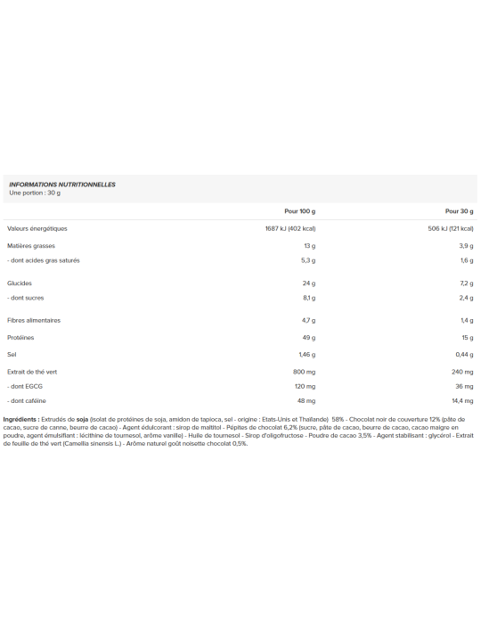 Zutaten: Sojaextrudate ( Sojaproteinisolat, Tapiokastärke, Salz - Herkunft: USA und Thailand) 58% - Dunkle Schokoladenkuvertüre 12% (Kakaomasse, Rohrzucker, Kakaobutter) - Süßungsmittel: maltitsirup - Schokoladenchips 6,2% (Zucker, Kakaomasse, Kakaobutter, mageres Kakaopulver, Emulgator: Sonnenblumenlecithin, Vanillearoma) - Sonnenblumenöl - Oligofruktosesirup - Kakaopulver 3,5% - Stabilisierungsmittel: Glycerin - Blatt-Extrakt aus grünem Tee (Camellia sinensis L.) - Natürliches Aroma Geschmack Haselnuss Schokolade 0,5%.