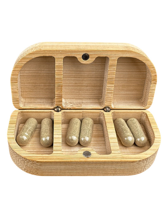 Die Nutraclear-Pillendose istkompakt, elegant und aus natürlichem Bambus gefertigt. Sie wurde entwickelt, um deine tägliche Wellness-Routine zu vereinfachen.
