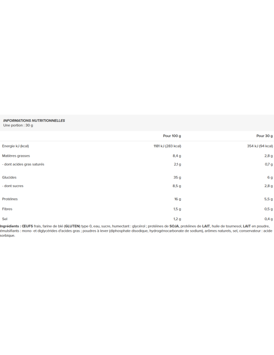Zutaten: Frische Eier, Weizenmehl(GLUTEN) Typ 0, Wasser, Zucker, Feuchthaltemittel: Glycerin; SOJA-Proteine, MILCHproteine, Sonnenblumenöl, MILCHpulver, Emulgatoren: Mono- und Diglyceride von Speisefettsäuren; Backtriebmittel (Dinatriumdiphosphat, Natriumhydrogencarbonat), natürliche Aromen, Salz, Konservierungsmittel: Sorbinsäure.