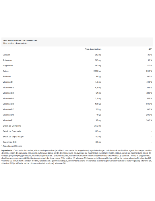 Zutaten: Calciumcarbonat, Kaliumchlorid (Säuerungsmittel: Magnesiumcarbonat), Füllstoff: mikrokristalline Cellulose, Füllstoff: Maisstärke, Chinarindenextrakt(Cinchona pubescens Vahl), Magnesiumoxid, Magnesiumbisglycinat (Säuerungsmittel: zitronensäure, Magnesiumoxid), Füllstoff: Polyvinylpolypyrrolidon, Vitamin E (Emulgator: modifizierte Stärke), Extrakt aus Kamille(Matricaria chamomilla L.), Gleitmittel: Mono- und Diglyceride von Fettsäuren, Coenzym Q10 (Ubichinon), Extrakt aus rotem Weinlaub(Vitis vinifera L.), Vitamin B3, mit Selen angereicherte Hefe, Kupfersulfat, Vitamin B1, Vitamin B2, Vitamin D3 (Emulgator: modifizierte Stärke, Verdickungsmittel: Gummi arabicum, Antioxidationsmittel: alpha-Tocopherol, Säuerungsmittel: Tricalciumphosphat, Pflanzenöl), Vitamin B6, Vitamin B12 (Säuerungsmittel: Zitronensäure - Trinatriumcitrat), Vitamin B8.