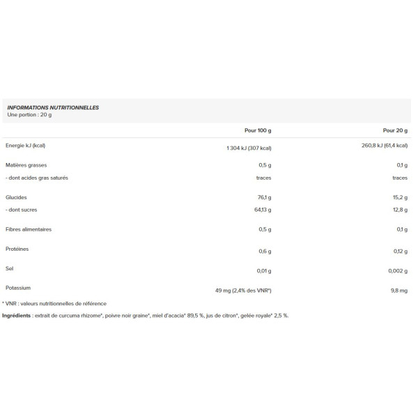 Seine einzigartige Formel ist mit Bio-Gelee Royale (2,5 %), Bio-Zitronensaft sowie Extrakten aus Bio-Kurkuma und schwarzem Pfeffer angereichert, die für ihre synergetischen Eigenschaften bekannt sind. Dieses traditionelle Duo ergänzt die Kohlenhydratzufuhr perfekt, indem es den Stoffwechsel auf natürliche Weise unterstützt und gleichzeitig deinen Verdauungskomfort respektiert.