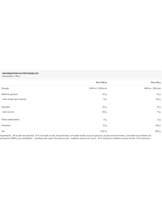 Zutaten: 39 % Pistazienpaste, 27 % Milchschokolade, weiße Schokolade, 6 % Kadaif-Paste, Glukosesirup, Magermilchpulver, Molkenproteinkonzentrat (WPC), Salz, Emulgator - Lecithine (aus Soja). Milchschokolade - Kakaotrockenmasse: mindestens 35 %, Milchtrockenmasse: mindestens 21 %.