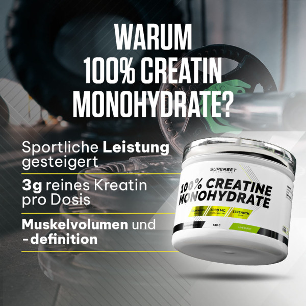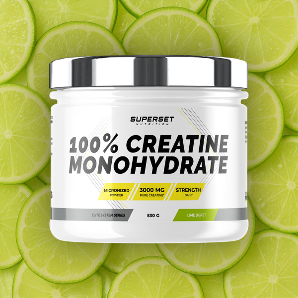 100% Creatine Monohydrate (530g) wurde von den Ernährungsexperten und Sporttrainern der Marke Superset Nutrition entwickelt und vereint mikronisiertes Creatinmonohydrat, hohe Reinheit und erfrischenden Limettengeschmack.