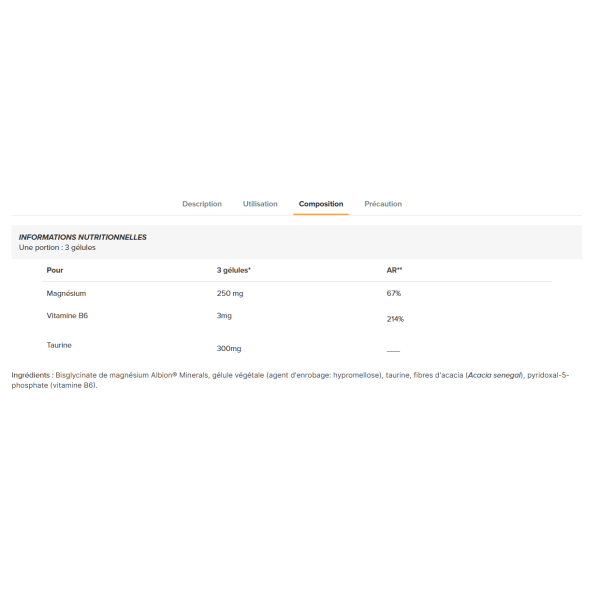 Zutaten: Albion® Minerals Magnesiumbisglycinat, pflanzliche Zellulosekapsel (Überzugsmittel: Hypromellose), Taurin, Akazienfasern (Acacia senegal), Pyridoxal-5-Phosphat (Vitamin B6).