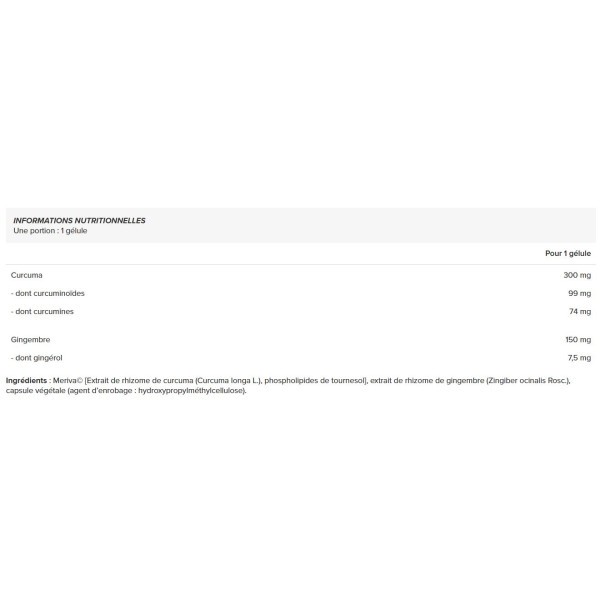 Zutaten: Meriva© [Extrait de rhizome de curcuma (Curcuma longa L.), phospholipides de tournesol], Extrakt aus Ingwerwurzelstock (Zingiber ocinalis Rosc.), pflanzliche Kapsel (Überzugsmittel: Hydroxypropylmethylcellulose).
