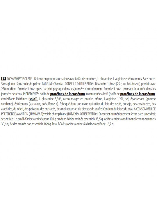 Zutaten Schokolade :Proteinisolat ausmolkeInstant 84% [Proteinisolat ausmolke, emulgator: Lecithin (soja)], L-Glutamin 5,3%, entfettetes Kakaopulver, Aroma, L-Arginin 1,2%, Salz, Verdickungsmittel (Xanthan), Süßstoffe (Sucralose, Acesulfam K).
