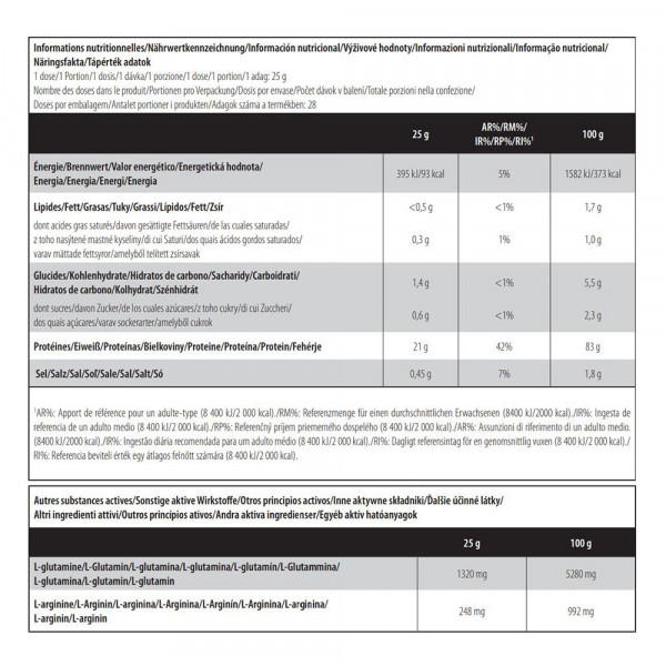 Zutaten Himbeere : Proteinisolat ausmolkeInstant 87% [Proteinisolat ausmolke, emulgator: Lecithin (soja)], L-Glutamin 5,3%, Aromen, L-Arginin 1,2%, Säuerungsmittel (Apfelsäure), Salz, Verdickungsmittel (Xanthan), Süßungsmittel (Sucralose, Acesulfam K), Farbstoff (Ponceau 4R*).*Kann bei Kindern unerwünschte Auswirkungen auf die Aktivität und Aufmerksamkeit haben.