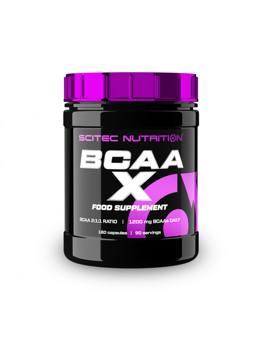 BCAA-X (180 Kapseln) der bekannten Marke Scitec Nutrition, fördert den Aufbau von Muskelmasse, indem es die Proteinsynthese steigert. Es wirkt außerdem antikatabol: BCAAs reduzieren den Proteinverbrauch und versorgen die Muskelzellen mit Energie.